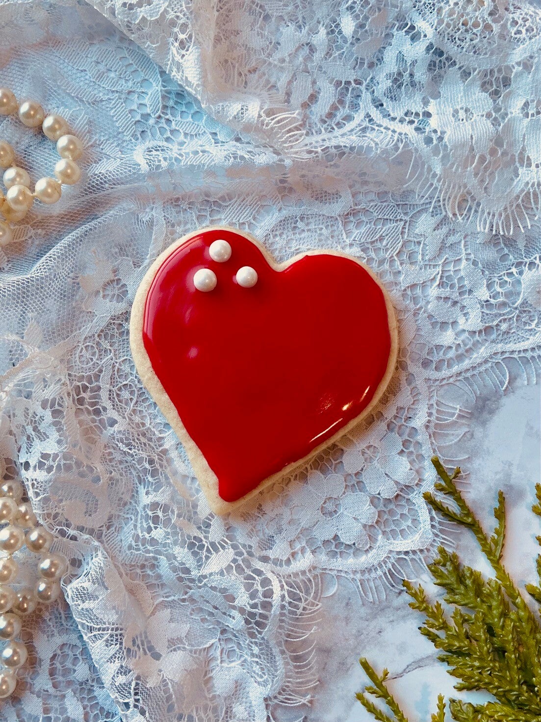 A soft, gluten-friendly sugar cookie baked into a classic heart shape. Decorated with edible pearls and sweet royal icing.