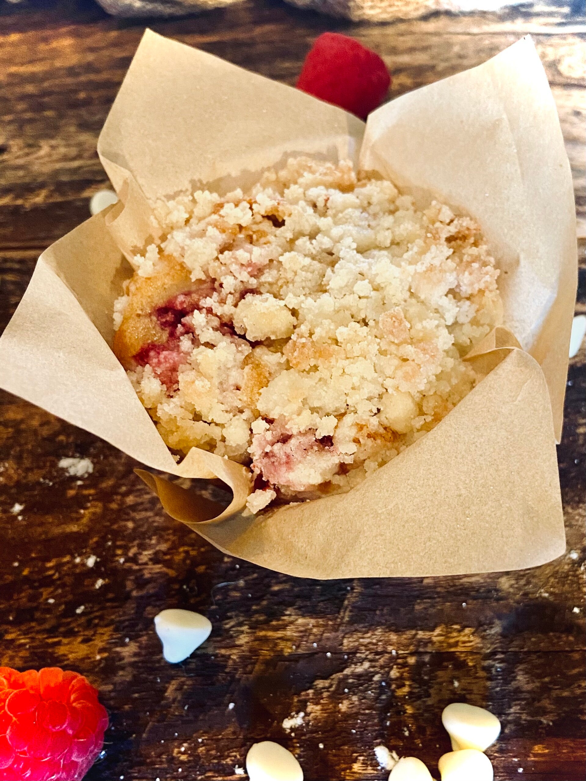 Fresh raspberries folded with premium Godiva white chocolate chips — a soft, buttery muffin with the perfect balance of bright berry and smooth, creamy sweetness.