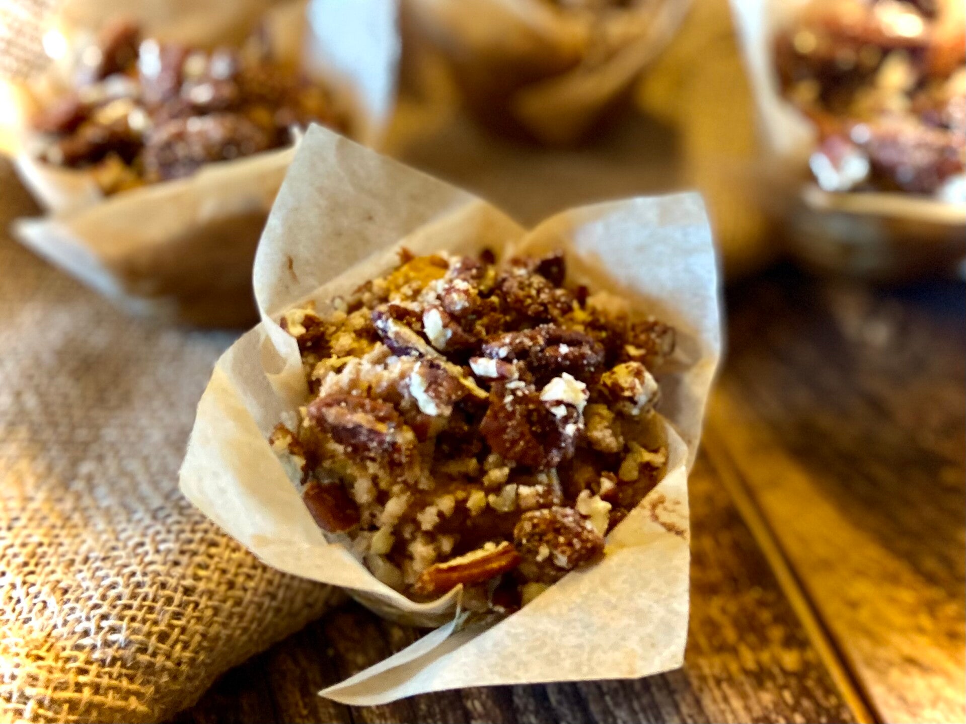 A soft pumpkin muffin with crunchy pecan bits throughout, topped with candied cinnamon pecans and buttery crumble. Just sweet enough — perfect for those who don’t like an overly sweet muffin.
